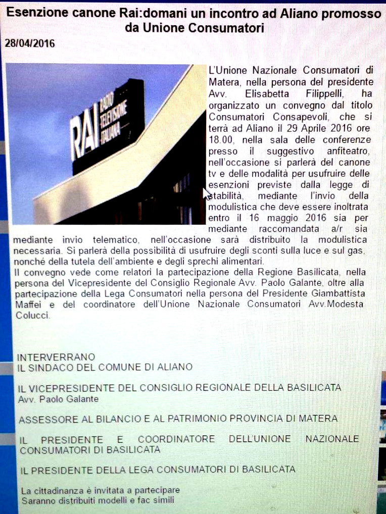 Esenzione canone RAI. Incontro ad Aliano promosso dall’Unc